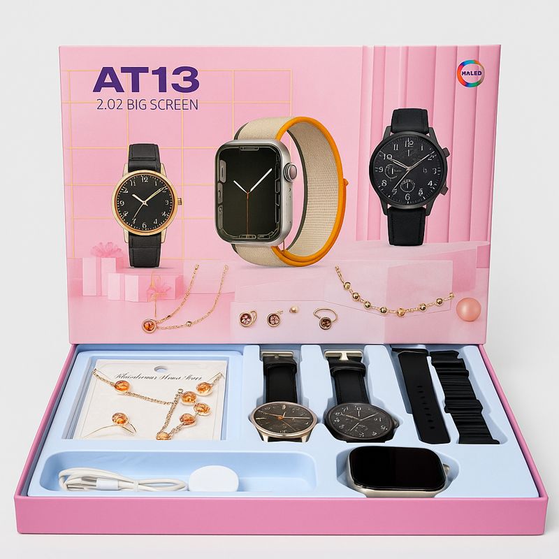 ست ساعت AT13 یکی از کاملترین و شیکترین پکهای موجود در بازار است که برای افرادی طراحی شده که بهدنبال یک هدیه خاص، کاربردی و چشمنواز هستند. این پک فقط یک ساعت هوشمند نیست، بلکه یک مجموعه چندتکه ارزشمند است که هم نیازهای دیجیتال و هم سلیقه کلاسیک و لوکس را پوشش میدهد.